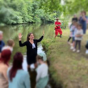 Außerdem gab es für alle die Möglichkeit, sich einen Segen zusprechen zu lassen und sich an die eigene Taufe zu erinnern - durch eine Tauferinnerungsaktion, natürlich stilecht mit Murgwasser. Der Gottesdienst endete mit einem großen, gemeinsamen Segenskreis. Es war ein festlicher Tag mit einer schönen, dichten Atmosphäre. Wir bedanken uns bei allen Helfenden und freuen uns schon aufs nächste Tauffest an der Murg!