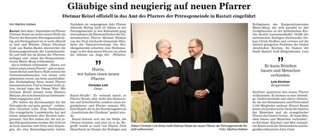Am 26. September 2025 wurde Pfarrer Dr. Dietmar Reizel offiziell in das Amt des Pfarrers in der Petrusgemeinde in Rastatt eingeführt. Lesen Sie dazu den Bericht von BNN-Redakteurin Martina Holbein, der am 29.09.2025 in den Badischen Nachrichten Ausgabe Rastatt erschienen ist. hier klicken