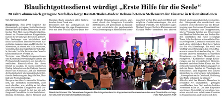 Seit 2005 begleitet die ökumenisch getragene Notfallseelsorge Rastatt/Baden-Baden Menschen in seelischer Not. Mit einem Blaulichtgottesdienst im Feuerwehrhaus Kuppenheim hat sie ihr 20jähriges Bestehen gefeiert. Hier geht's zum ganzen Artikel